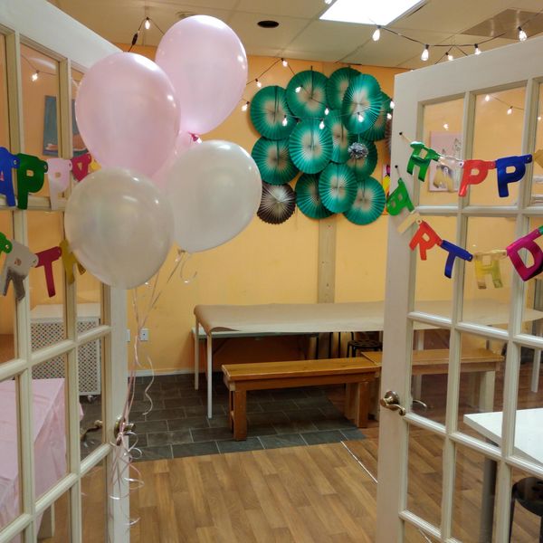 Presents and table top decor are allowed with all event room bookings. Balloons on ribbons or strings are fine. No loose/floor balloons or balloon prep is allowed in the studio.
